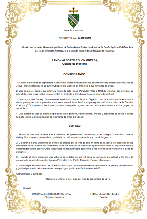 Decreto Homenaje Póstumo Cardenal José de Jesús Pimiento